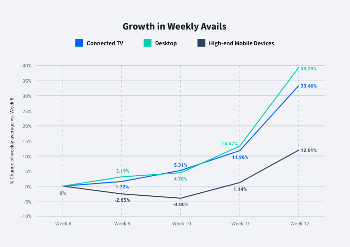 Trends from an inventory partner indicate a 13% uplift in avails from Week 11 to 12 (March 9 and March 16). Compared to data from 30 days ago, CTV avails saw a 33% uplift while ad opportunities from desktop and high-end mobile devices see an uplift of 39% and 12% respectively.